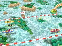 In this mini-game, the object in the game is for the player and his or her partner to tilt the control stick from side to side to advance. The player and the partner that reaches the finish line wins. To succeed, the player must consecutively tilt with synchronization, as the mini-game's name implies. In the intro, the player and the other 7 players are all divided into 2 individual teams, making 4 canoes. The player gets ready by putting both hands onto the paddle.