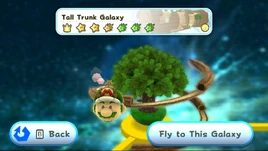 The Tall Trunk Galaxy is a galaxy of World 3 in Super Mario Galaxy 2. It is one of two to be immediately available, and is unlocked when Mario defeats Bowser in the latter's Lava Lair, having at least 17 Power Stars in his possession as a result. Completing its first mission leads to the Haunty Halls Galaxy, unless the player completed the first mission of the Freezy Flake Galaxy beforehand. Its icon depicts the starting planet with a wooden slide spiraling around it.