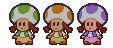 All members of the Three Beautiful Sisters are Toads but with different colors. Kris T. is the one with green spots and green clothing, Miss T. has orange spots wearing orange clothing, and Felissa T. has purple spots with purple clothing.