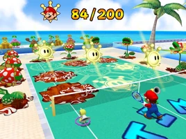 The player must shoot water balls to brown goop spots, which are spit out by Piranha Plants on a 3x3 grid on the opposite side; a Shine Sprite is found under each goop spot. To score points, the player's character has to line up three Shine Sprites either vertically, horizontally, or diagonally, in a manner similar to how tic-tac-toe is played, and it is possible to make more than one match at a time. The water balls are shot by F.L.U.D.D. nozzle heads by pressing a button to turn it on. After lining up three Shine Sprites, Piranha Plants spit out goop to cover the spots again.