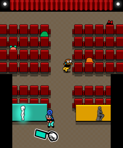 When she took over the microgame, Penny Crygor redesigned it and put the protagonist, who now appears as a disembodied hand holding a flag, in the theatre close to the back. The bathrooms are no longer seen due to their off-screen positions, and the pink bathroom is now yellow.