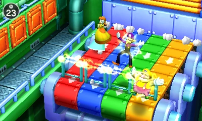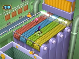 The goal of the minigame is to run and jump over the hurdles on the conveyor belts without falling into the pit. The conveyor belts start to gain speed as time goes on. There are two kinds of hurdles: normal ones and electrified ones. If a player touches an electrified hurdle, they are temporarily frozen, and thus it may cost them the game. Players who fall into the pit are eliminated. The last player standing wins. If two or more players last the time limit (30 seconds), then the remaining players win. However, if the remaining players are eliminated at the same time, the minigame ends in a tie.