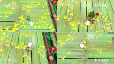 There is an icon on the bottom-right corner that shows the distance between the player and the goal. If players slip on a Banana Peel, they are stunned for a second. The first player who reaches the end of the goal wins the minigame. The player on first and second place does their victory animation while the third player does their neutral animation. Sometimes an arrow appears, directing them to the goal.