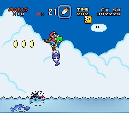 The player starts on a mushroom platform, and they must use the dolphins to get across the water quicker. They will reach another island with a ? Block high up top a mushroom platform and the first Dragon Coin beside it. Then the player should cross more dolphins and get on another island with the second Dragon Coin. After this area, a Porcupuffer will start to swim around and chase the player. The dolphins tend to dive into the water, making it a tad bit tricky to dodge the large fish. The player should keep jumping on the dolphins and get to the checkpoint. After the checkpoint they should jump on dolphins that leap up and down the water, with the third Dragon Coin in the middle of two dolphins. The player should finally ride on the many dolphins through a couple of coin-made arrow signs, taking you to the end Warp Pipe with the fourth Dragon Coin (in the Game Boy Advance version, the fourth Dragon Coin appears to be in the third coin arrow, making this the fifth Dragon Coin instead).