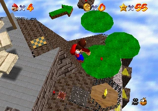 In this mission, Mario has to use the help of Hoot to soar into the sky to a floating caged isle containing a small entrance with a Power Star in the center of the cage. In the remake, the Power Star is enclosed by the cage with a small door-shaped entrance to the Power Star. A more risky-considered way for Mario to get the Power Star is for him to use the cannon. As mentioned, Hoot is found at the top of the tree behind Mario when directly starting the level. The island is different in appearance between the two versions of Super Mario 64. In the original, the island is a small Island with cage bars around it while in the remake, the island is larger, has a fence around it, and the Star is located inside a mesh "house" resembling a chicken coop.