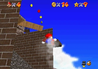 In order for Mario to do this level, he must head off to the Bob-omb Buddy aforementioned on Shoot Into the Wild Blue. He must simply use the cannon to blast himself with enough momentum force to destruct a chip of the wall. He must simply aim for the top-right to reveal a Power Star on it that he can obtain on the ledge.