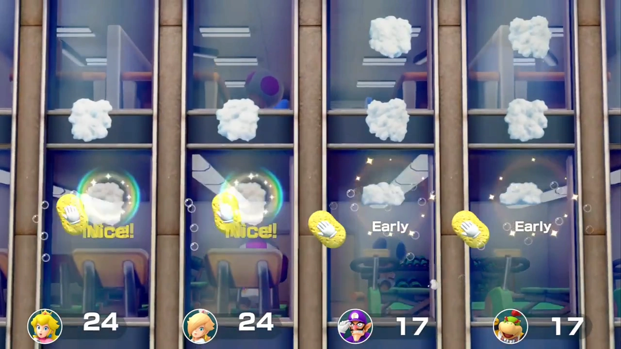 Wiped Out (ピッカピカ窓ふき Pikkapika mado fuki?, Sparkling Window Cleaning) is a Rhythm minigame in Super Mario Party.