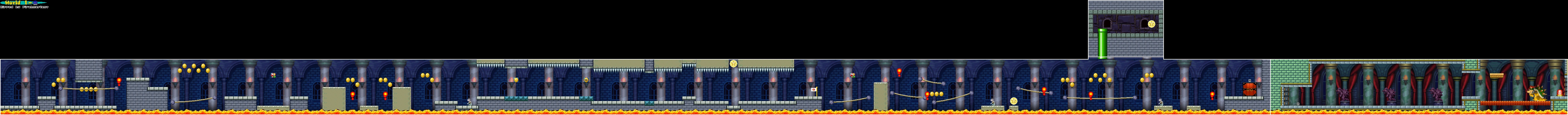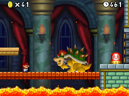 In the first part of the level, there is a tightrope and a Podoboo. Then, there is another tightrope and a Question Block on top of a rising platform. Mario will then have to jump over a pit to the next platform to proceed. In the gaps between the next few platforms, there are Podoboos, so Mario must be careful in this area. After this, there is a longer gap without a Podoboo and a Dry Bones. After this Dry Bones, there are walls with spikes on them, and Mario can be crushed by them. Between two of the walls, there is a Question Block, and in another gap, there is a block which Mario can repeatedly hit to get many coins. If Mario Wall Jumps in one of the gaps, he can get the first Star Coin of the level. After that, Mario will come across another tightrope, and he will get to the Midway Point of the level. After this, there is another platform and a few more tightropes, as well as another Podoboo. After the tightropes, there is a Dry Bones on top of a platform. The platform beside the platform with the Dry Bones will rise in and out of the lava, and if Mario jumps on top of it quickly, he can grab the second Star Coin in the level. Then Mario should jump over another Podoboo, and he will encounter two more platforms, one of which has a Dry Bones on it. Mario should avoid the Podoboo, and then enter the battle with Bowser. Before battling the Koopa King, Mario will walk through a hall filled with statues of Bowser. Then, he will enter a room similar to Bowser's room from Super Mario Bros. In the fight with Bowser, Bowser will attack by shooting fireballs at Mario. Mario can easily defeat him by jumping over Bowser with the platform in the room and hitting the switch, which will destroy the room's floor. Hitting Bowser nine times with fireballs, spinning into him with the Blue Shell three times, or stomping on him with the Mega mushroom will also finish him off. When Bowser falls into the lava, he will transform into Dry Bowser, and World 1 is completed.