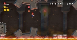 This is the first castle level. It features several cogs as well as Thwomps. Larry Koopa is fought here as a boss again. The background music on the castle level is played by the pipe organ. |