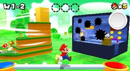 World 1 is the first world in Super Mario 3D Land. There are four levels, a castle, a Mystery Box, and a Toad House.