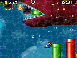 This level is an autoscrolling underwater level, and introduces Unagis and Mega Unagis. The level is also filled with Cheep Cheeps and Warp Pipes, most of which will blow out air.