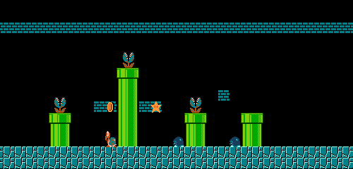 This is the second and overall the final underground course in the game. Enemies consist of Little Goombas, Koopa Troopas, Buzzy Beetles, and Piranha Plants. One secret area is featured in this level, and just like 1-2, it contains a Warp Zone, which this time is placed above ground. The player is given a time limit of 400 seconds. |