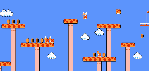 This is yet another level set at extreme heights. Moving orange platforms are once again utilized. Enemies include Koopa Troopas and Koopa Paratroopas. This is the only level to take place atop giant spotted mushrooms rather than ordinary treetops. The player is given a time limit of 300 seconds. |