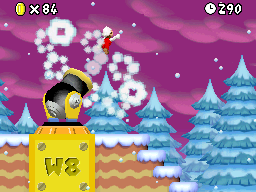 Takes Mario or Luigi to World 8. Despite being in a snowy forest, World 8's purple sky is seen in the background. |