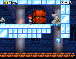 An upward auto-scrolling tower level where Mario or Luigi ride a large platform up, whilst avoiding Spiked Balls and Dry Bones. Bowser Jr. can be jumped on normally this time, although the arena is covered in ice. |