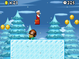 - "“There is a dramatic climate change in World 5, where warm weather makes way for a frosty, snow-covered landscape. Mario has to deal with super-slick ice patches, chest-deep snow banks and rolling snowballs in this winter wonderland.”"