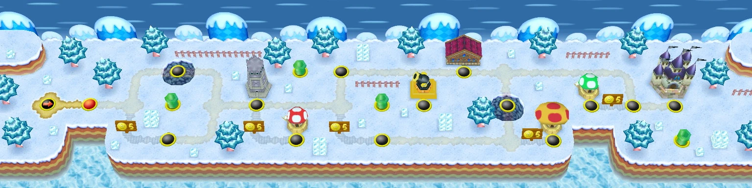 The world is set in a snowy plain filled with icy mountains and ground, similar to Ice Land from Super Mario Bros. 3. The boss of this world is Petey Piranha, who has to be defeated by ground-pounding on him three times, allowing access to World 6, though if the player completes the castle in mini form, they will gain access to World 7 instead.