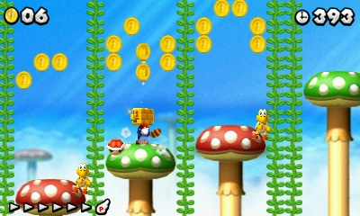 First off, Mario begins on a cliff in front of Beanstalks, coins, mushroom platforms and Koopa Troopas. Moving forward, there is a green pipe which takes the player to the main area. As Mario comes out from the pipe, the level begins autoscrolling. A Chain Chomp can be seen on the right. Above, there are Brick Blocks, ? Blocks and a red POW Block. The Brick Blocks contain Beanstalks and the ? Block on the right contains a Super Leaf. Climbing up the Beanstalk, there are several coin rings spinning around. Even more Beanstalks appear from blocks where there are several Koopa Paratroopas. A Chain Chomp can then be seen on a green mushroom platform. Going past it, there are several hidden blocks containing 1-Up Mushrooms on the right. Going further up is the Checkpoint Flag. More Beanstalks and a Super Leaf can be found. This is followed by circling Paratroopas and a Red Ring. Just after that, several Koopas and a Gold Ring can be found along with more blocks containing Beanstalks. Another Paratroopa ring can be found enclosing the third Star Coin. Further up are more Beanstalks and Chain Chomps. After that, a green pipe leading out of the area can be found. Moving right, a lone red Paratroopa can be seen, followed by the Goal Pole. Completing this level will unlock World Mushroom