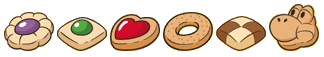 Yoshi Cookies are a favored snack of the Yoshi species. They are featured as a special item in various Mario titles, first appearing in the game Yoshi's Cookie . They come in a variety of shapes and colors, including flowers, hearts, circles, checkered squares and even a head that resembles Yoshi. Some cookies come in flavors, such as chocolate, vanilla and sugar cookies with icing in the middle or even a checkerboard design.
